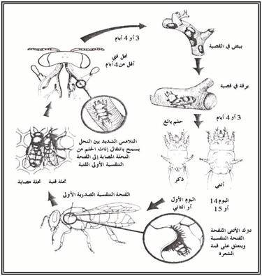 حلم داخلي يسمى Acarapis woodi طوله (0.1) ملم لونه أصفر فاتح يصبح بعد 4 أيام يرقات تتغذى