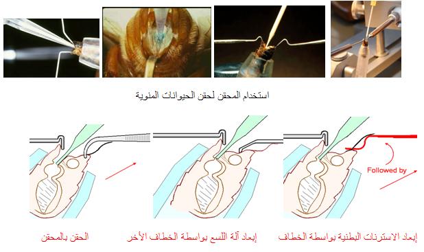 المحقن: وهو يستخدم في سحب السائل المنوي من نهاية الذكر وكذلك يستخدم في حقن السائل المنوي في قناة المبيض المشتركة في الملكة.