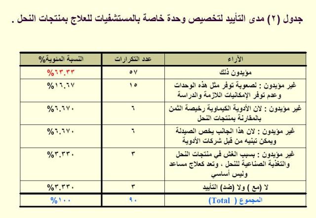 جدول ( ٢) مدى التأييد لتخصيص وحدة خاصة بالمستشفيات للعلاج بمنتجات النحل .