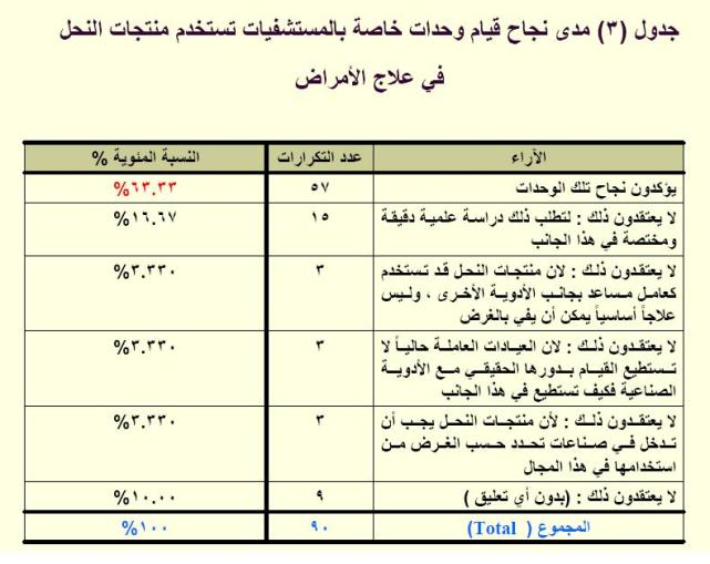 جدول ( ٣) مدى نجاح قيام وحدات خاصة بالمستشفيات تستخدم منتجات النحل في علاج الأمراض