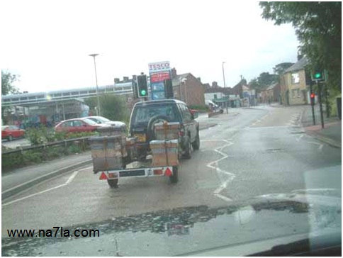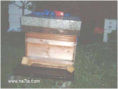 الخامسة من صباح يوم رطب من آب، وقد سر النحال لسقوط قليل من المطر، فقد بقيت كل النحلات في الداخل جافة، لذا كان من السهل الإغلاق عليها بالإسفنج الرغوي. |