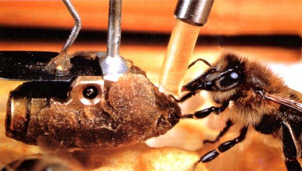 وفي أول سلسلة من تجاربنا عمدنا إلى تدريب النحل على الربط بين صوت يستمر مدة خمس ثوان وبين صدمة كهربائية خفيفة جدا تصل بعد أربع ثوان من بدء الصوت الذي كنا نطلقه من النهاية المفتوحة لأنبوب زجاجي ضيق. وكان شأن هذه الصدمة لو وصلت غير مقرونة بالصوت إلى نحلة تتناول طعامها، أن تصرفها عن وعاء الطعام لبضع ثوان، غير أن النحلة لا تلبث أن تعود لتستأنف تناول طعامها. ومن هنا خطر ببالنا السؤال التالي: ترى لو تكرر اختبار النحلة بحافز غير مرغوب فيه ـ كالصدمة الكهربائية ـ بعد سماع صوت معين فهل سيأتي عليها وقت تتعلم فيه أن عليها الانصراف عن الطعام خلال الثواني الأربع الأولى التالية لسماع الصوت وقبل وصول الصدمة؟ لو كان الجواب بالإيجاب فالنحلة إذًا تستطيع أن تسمع وبالتالي أن تتعلم. وقد وجدنا أن النحلة حشرة قابلة للتدريب حقا على الاستجابة للأصوات التي يحملها الهواء، ولو أنها كانت تتعلم ذلك ببطء شديد.