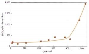 إن نطاق تردد الأصوات التي يمكن للنحلة كشفها يمتد إلى مدى بعيد دون النطاق الذي تلتقطه أذن الإنسان. وهذا الرسم البياني يوضح مدى السرعة التي يتحتم أن تنتقل بها جسيمات الهواء المجاور لأجنحة النحلة الراقصة لكي تحدث إشارات مسموعة. وفي حدود هذا النطاق تستطيع النحلة أن تميز بين الأصوات المتبانية التردد.