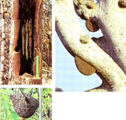 ربما كان لطبائع اتخاذ العش أثرها في نشوء لغة الرقص كما تؤديها الأنواع المختلفة من نحل العسل. فالنحلة من نوع أپيس فلوريا (في أسفل اليسار) ـ وهي التي تعتبر أكثر الأنواع بدائية من حيث السلوك ـ لا تصدر عنها أصوات أثناء الرقص، وهي تعشش في الخلاء ولا ترقص إلا في النهار. والنحلة من نوع دورساتا (في الأعلى) تعشش أيضا في الخلاء ولكنها ترقص ليلا في بعض الأحيان، ورقصها مصحوب بالصوت كما هي الحال في النحلة من نوع سيرانا (في أعلى اليسار). وكذلك الحال في النحلة الغربية المألوفة التي ترقص عادة في أعشاش مظلمة.