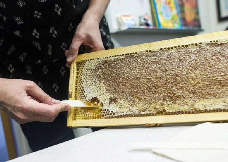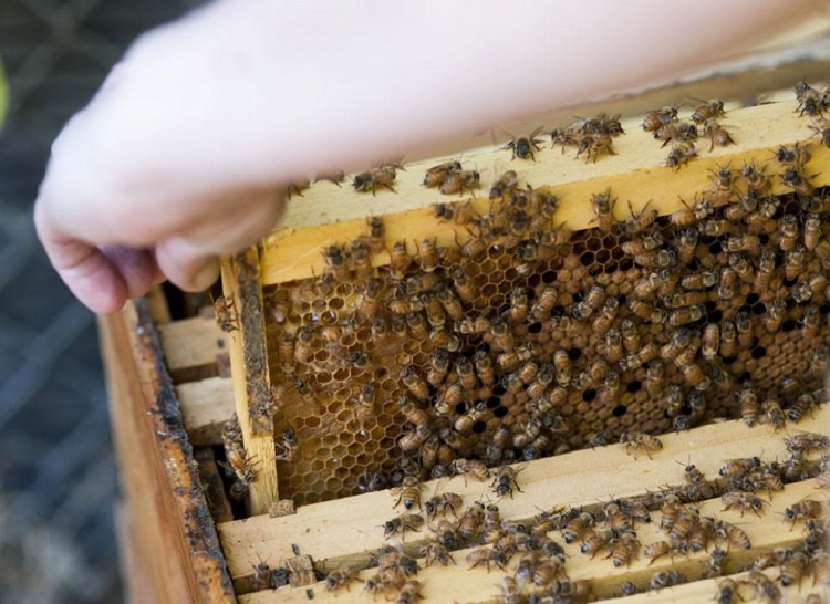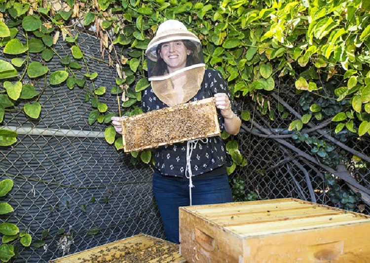 راشيل ماكلبرانغ تحمل إطار العسل. تصوير باتريشيا كاريلو.