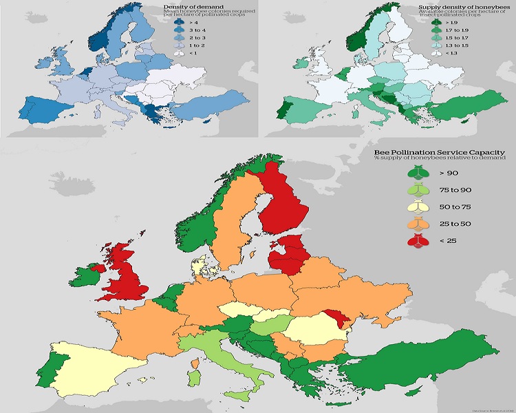ووفقًا لدراسة شملت 41 دولة أوروبية، ارتفع العدد الإجمالي لأعداد نحل العسل بنسبة 7٪ في المائة بين عامي 2005 و 2010 (إلى ما يقدر بـ 13.4 مليون خلية بسبعة مليارات من نحل العسل). ومما يشار له أن 15 بلداً شهدت أيضاً انخفاضاً يتراوح بين 4 في المائة في سلوفينيا إلى 47 في المائة في سويسرا. وفي الوقت نفسه، فإن المزيد من محاصيل الوقود الحيوي (حشائش البذور الزيتية ودوار الشمس وفول الصويا) تعني زيادة الطلب على التلقيح. توضح سلسلة الخريطة هذه الصلة بين كثافة نحل العسل وعدد الخلايا المطلوبة لتوفير خدمات التلقيح. يتفاوت عرض نحل العسل بالنسبة إلى الطلب الوطني بشكل كبير بين الدول الأوروبية. من بين جميع البلدان المشمولة في المسح ، تجاوزت المملكة المتحدة النقص في عسل النحل فقط من قبل مولدوفا.