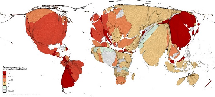 هذا الرسم البياني يوضح متوسطاستخدام المبيدات لكل منطقة من الأراضي الزراعية. ويستند هذا التحويل إلى تقنية رسم بياني متداخل تكون فيه كل شبكة مربعة فوق الأرض متناسبة مع المساحة الكلية المستخدمة للمحاصيل. يظهر مفتاح اللون الاستخدام الزراعي السنوي لمبيدات الآفات مقسوما على مساحة الأراضي الزراعية في كل بلد. وتشمل المبيدات الفطرية ومبيدات البكتريا ومبيدات الأعشاب والمبيدات الحشرية ومنظمات نمو النباتات ومبيدات الفطور لمعالجة البذور والمبيدات الحشرية لمعالجة البذور والزيوت المعدنية ومبيدات القوارض والمطهرات. قامت منظمة الأغذية والزراعة بتجميع البيانات.