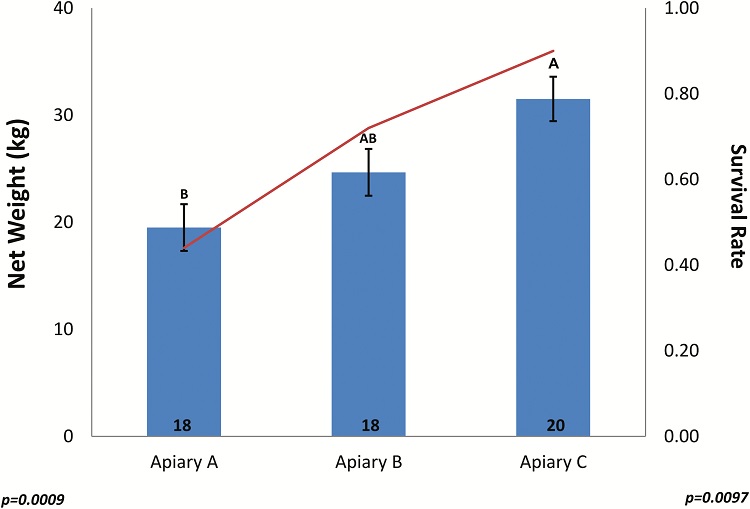 تأثر النجاح المتخلف في الوزن وحجم النحل الذي وصلت إليه الخلايا قبل الشتاء حيث كان وزن الخلية الأعلى مؤشرا قويا على بقاء في الفترة الشتوية. على الرغم من أن عدد المواقع المستخدمة في هذه الدراسة كان محدودًا، إلا أن الفرق في متوسط أحجام الخلايا من مواقع مختلفة يمكن أن يعزى إلى وفرة وتنوع موارد الأزهار بالقرب من خلايا نحل العسل. تشير نتائجنا إلى أن: