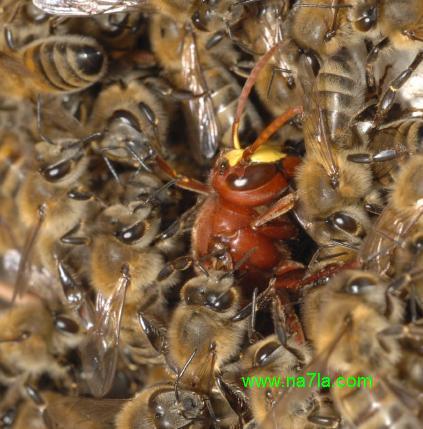 تستجيب نحلات العسل اليابانية لهجوم الدبور الياباني العملاق بطريقة فعالة وقوية: تتكتل على الدبور وتقوم بتحميصه!.