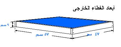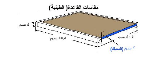 إطار سمك الدف 2 سم، عرض الدف 9 سم، الطـول الكلي 57 سم، العـرض الكلي 47 سم يثبت فوقه قاعدة خشبية بسمك 2 سم.