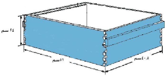 عرض صندوق التربية = (سماكة الخشب×2) + (فراغ لسهولة الحركة ×عدد الإطارات) + (عرض قائمة إطار من الأعلى× عدد الإطارات) = (2×2) + (0.05×10) + (3.6×10) = 40.5 سم