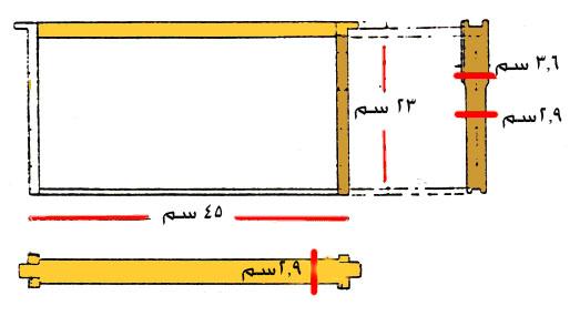 عرض صندوق التربية = (سماكة الخشب×2) + (فراغ لسهولة الحركة ×عدد الإطارات) + (عرض قائمة إطار من الأعلى× عدد الإطارات) = (2×2) + (0.05×5) + (3.6×5) = 22.25سم.