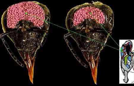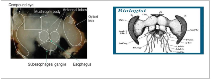 تستقبل الفصوص البصرية المدخلات البصرية من العيون المركبة، مركزالدماغ له جسم فطري يحدث فيها لحفظ الذاكرة لدى الحشرات، أما المدخلات السمعية فتذهب إلى فصوص قرون الاستشعار، المريء (قناةالغذاء) تمر من خلال فتحة مكونة من اندماج العقد العصبية الفرعية المرئية مع فصوص قرون الاستشعار، غدد الإفراز الداخلي CC-CA متمركزة حول المريء.