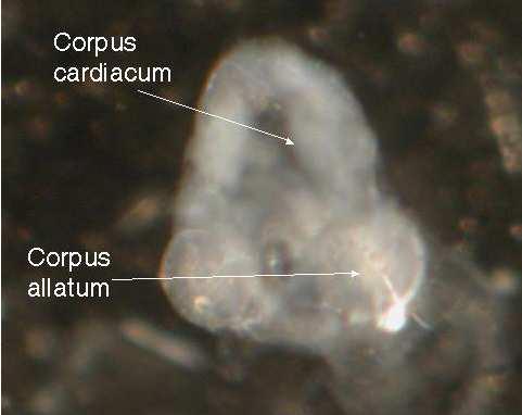 corpora cardiaca (CC): تسمى بغدد الجسم القلبي الموجودة خلف المخ وهو عضو دموي عصبي ومخزن لإطلاق الهرمونات الأخرى عند الحاجةمثل :