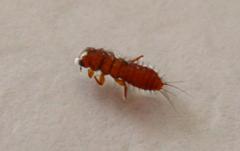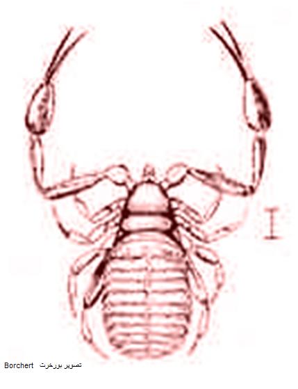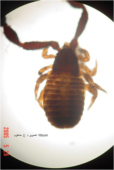 يبلغ طوله /3-4/مم، لونه بني غامق و له أربعة أزواج من الأرجل المفصلية المتوضعة على حلقات الصدر وله زوج من المخالب القوية التي تتألف من أربعة عقل.