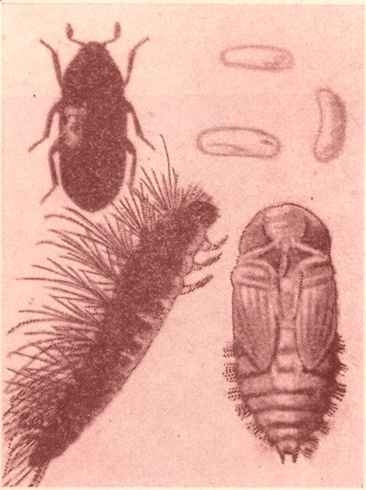تتبع هذه الخنفساء فصيلة Dermestidae ،وتوجد في المستودعات وفي خلايا النحل العامرة والفارغة، وتتطفل على الجلود والأمعاء والمواد الغذائية، وتعيش في حظائر الحيوانات وأبراج الحمام حسب نوجدين (8). يشاهد طورها اليرقي أحياناً في طوائف النحل وتهاجم الإطارات الشمعية . وغالباً ما توجد في الطوائف المهملة والمستودعات. وعند مهاجمتها للخلايا الخشبية فإنها تشكل خطراً كبيراً عليها، ومصدر قلق وإزعاج للنحل. وتتطفل هذه الحشرات على حبوب الطلع ومن الممكن أن تنقل بعض الأمراض وخاصة مرض تعفن الحض الأمريكي.