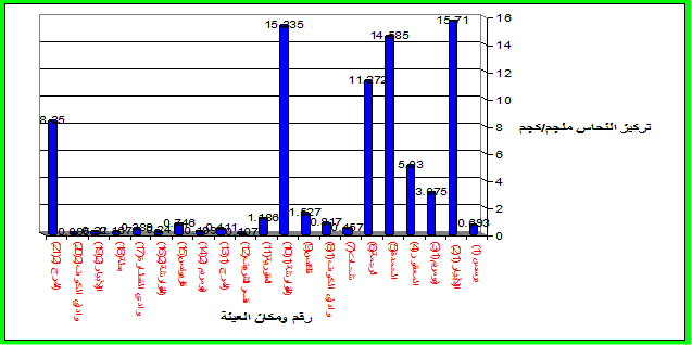 النحاس احد العناصر الأساسية essential الموجودة في العسل ولكن بكميات قليلة trace وهو من العناصر الغير سامة إذا كان تركيزه اقل من الحد المسموح به . من خلال الجدول (3) والشكل (9) نرى أن تركيز عنصر النحاس في المدى من 0.095 ملجم/كجم إلى 15.71 ملجم/كجم والمتوسط يساوي 3.839 ملجم/كجم .