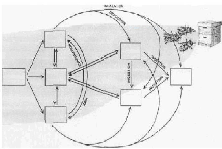 شكل (1) انتشار الملوثات في البيئة وتمثل المنطقة المظللة التي يزورها النحل بصورة يومية