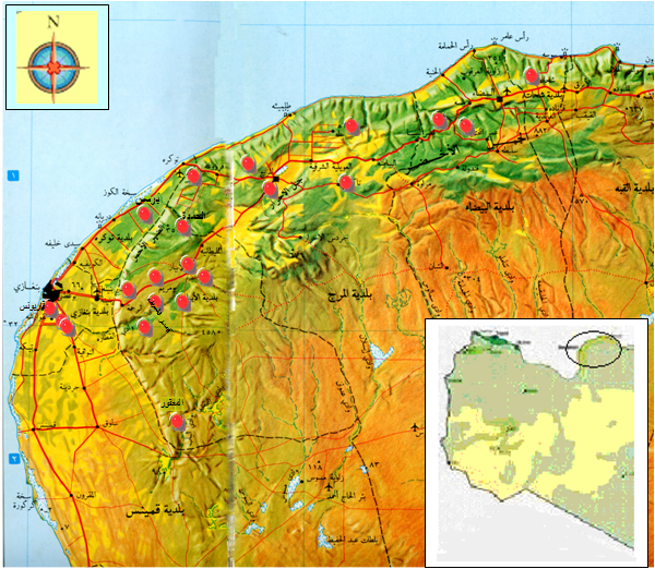 تقع منطقة الدراسة في المنطقة الممتدة من مدينة بنغازيغرباً إلى مدينة شحات شرقاً وعلي الشريط الساحلي في المنطقة الشرقية من ليبيا ، تتميز هذه المنطقة بخصوبة تربتها وجودة إنتاجهاالزراعي حيث يتوفر فيها محاصيل القمح والشعير بأجود أنواعه ، كذلك العديد من محاصيلالخضروات الأساسية لحياة الإنسان ، وأنواع من أشجار الفواكه مثل العنب والتفاح والخوخ ، وكذلك أشجار البلوط والشماري والعرعار والزعتروالسدر و الخروب والكافور وغيرها من الأشجار التي لا تفقدخضرتها بتغير فصول السنة ، وتعتبر أزهار هذه النباتات غذاء جيد للنحل لإنتاج كثير من أنواع العسل ، كما تتميز هذه المنطقة بجودة إنتاجها للعسل الطبيعي ، حيث يعتبر مناخهذه المنطقة مناخاً ملائماً لتربية النحل ولهذه الأسباب تم اختيار هذه المنطقة لتكون منطقة الدراسة والشكل (2) يوضح تضاريس منطقة الدراسة وكذلك موضح علي الشكل أماكن أخذ العينات.