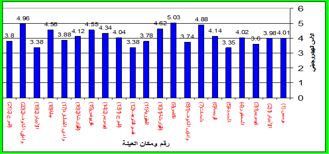 أما فيما يتعلق بالمواصفة التشيكية فأن تركيز الكادميوم في العسل لايتجاوز 0.5 ملجم/كجم وبالمقارنة مع النتائج المتحصل عليها في عينات العسل المدروسة، نجد أن جميع العينات المدروسة متوافقة مع هذه المواصفة ماعدا العينات 8 ،9 ، 10 ، 13 ، 14 ، 15 ، 16 ، 17 ، 21 فهي أعلى من المعدل المطلوب دليل على تلوث هذه العينات بالكادميوم وبالتالي تلوث المناطق التي أخذت منها العينات . أما المواصفة( OMS 975/88) فأن الحد الأقصى المسموح به (MAL) لعنصر الكادميوم هو 0.02 ملجم/كجم بالمقارنة مع النتائج المتحصل عليها نجد أن جميع العينات المدروسة أعلى من الحد الأقصى المسموح به في هذه المواصفة ماعدا العينات 2 ،3 ،4 فقط المتوافقة مع هذه المواصفة ، الجدول رقم (5) يبين مقارنة النتائج المتحصل عليها مع نتائج عسل بعض دول العالم ، وعند دراسة النتائج المتحصل عليها نجد أن أعلى تركيز سجل في العينات رقم 8 ( وادي الكوف(1) ) ، 9 ( تاكنس ) ، 10 ( القوارشة(1) ) ، 16 ( القوارشة(2) ) ، 17 ( وادي القطارة).