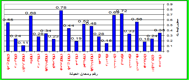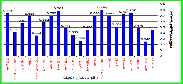 فيما يتعلق بالمتغير الرابع الموصلية الكهربائية electrical conductivityEC)) والذي يعتبر من المتغيرات الجيدة لقياس جودة العسل ومن خلال الجدول (2) والشكل (6) نرى أن المتوسط يساوي mS/cm 0.56 والمدى من mS/cm 0.246 إلى mS/cm 0.798 وهذه النتائج متوافقة مع (Codex Alimentarius ) (mS/cm 0.8 < ) ، ومتوافقة مع المواصفة الخليجية (mS/cm 0.8 < ) ومتوافقة مع المواصفة الأوربية (mS/cm 0.8 < ) ، ووفقا لهذه النتائج تعتبر عينات العسل المدروسة مطابقة للمواصفات العالمية وذات جودة عالية .