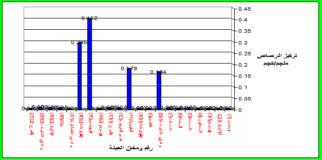 يعتبر الرصاص من العناصر غير الأساسية non essential الموجودة في العسل ،وهو من أهم العناصر الثقيلة ذات السمية العالية بالإضافة إلى عنصر الكادميوم . ومن خلال الجدول (3) والشكل (7) نلاحظ أن مدى تركيز عنصر الرصاص في عينات العسل من 0.001 ملجم/كجم إلى 0.402 ملجم/كجم والمتوسط الحسابي يساوى 0.053 ملجم/كجم،بمقارنة هذه النتائج مع المعدلات المسموح بها في بعض دول العالم ، نجد أن الحد الأقصى المسموح به في ليبيا ووفقا للمواصفة الصادرة في 2008 لايزيد على 0.5 ملجم/كجم وبالمقارنة مع النتائج المتحصل عليها في عينات العسل المدروسة نجد أن جميع العينات أقل من الحد الأقصى المسموح به وجميع العينات مطابقة لهذه المواصفة ولا يوجد تلوث في مناطق أخذ العينات ، نجد أن الحد المسموح به في بولندا للرصاص في العسل من 0.4-0.5 ملجم/كجموبالنظر إلى النتائج المتحصل عليها نجدها جميعها تحت هذا المعدل ولا يوجد بها تلوث بالرصاص استنادا لهذا المعيار ، أما الحد الأقصى المسموح به ( MRL) للرصاص في العسل للاتحاد الأوروبي EU هو(ملجم/كجم 1.0 ) واستنادا لهذا الحد فأن جميع النتائج المتحصل عليها اقل من الحد الأقصى المسموح به ولا يوجد تلوث بالرصاص في هذه العينات ، أما فيما يتعلق بالمواصفة التشيكية والتي تقول بأن تركيز الرصاص في العسل لايتجاوز 8.0 ملجم/كجم نجد أن جميع العينات اقل بكثير من هذا المعدل ، أما في المواصفة (OMS 975/88) فأن الحد الأقصى المسموح بهلعنصر الرصاص 0.2 ملجم/كجم وبمقارنتها مع النتائج المتحصل عليها نجد أن جميع العينات متوافقة مع هذه المواصفة ماعدا العينات رقم 15 ، 16 كانت أعلى من المطلوب ، الجدول رقم (4) يبين مقارنة النتائج المتحصل عليها مع نتائج عسل بعض دول العالم ، وبالنظر إلى العينات التي وجدت بها نسبة عالية من التلوث بالرصاص نجد أن أعلى تركيز سجل في العينة رقم 15 والتي التقطت من منطقة قاريونس (ملجم/كجم 0.402 ) والعينة رقم 16 والتي أخذت من منطقة القوارشة (2)( 0.295 ملجم/كجم) والعينة رقم 11 والتي أخذت من منطقة المرج (0.179 ملجم/كجم) والعينة رقم 8 والتي أخذت من منطقة وادي الكوف (0.164 ملجم/كجم) ، وهى مناطق مختلفة ويوجد بينها مسافات بعيدة وعليه فأن سبب التلوث ليس مشترك ،باستثناء العينتان 15 ،16 فالمسافة بين العينات ليست بعيدة وربما تشترك في نفس سبب التلوث وهو القرب من التجمعات السكانية من ناحية والقرب من الطرق الرئيسية من ناحية أخرى وخاصة العينة رقم 15 التي التقطت من جامعة قاريونس والتي تبعد مئات الأمتار فقط عن طريق بنغازي طرابلس الرئيسي وكذلك وجود حركة سير المركبات داخل الجامعة وبصورة مكثفة جدا ويومية.