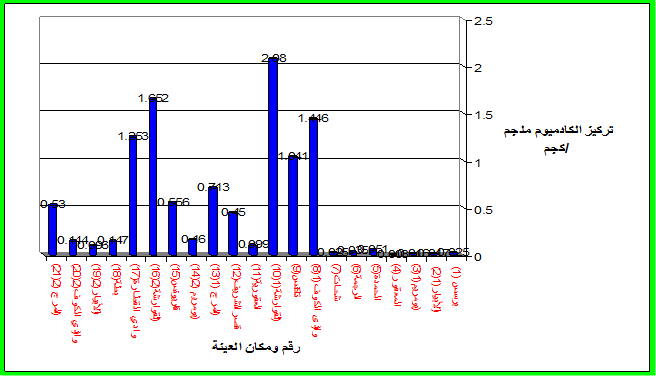 عنصر الرصاص متوسط نتائج العينات 0.053 ملجم/كجم والمدى من 0.001 ملجم/كجم إلي 0.402 ملجم/كجم، وعنصر الكادميوم متوسط نتائج العينات 0.502 ملجم/كجم والمدى من 0.003 ملجم/كجم إلي 2.08 ملجم/كجم، وعنصر النحاس متوسط نتائج العينات 3.839 ملجم/كجم والمدى من 0.095 ملجم/كجم إلي ملجم/كجم 15.71 .