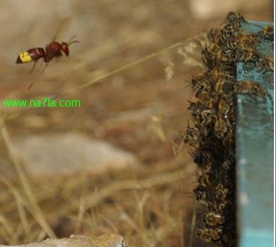 هجوم الدبور على خلايا النحل حيث يقوم باقتناص عاملة من مدخل الخلية
