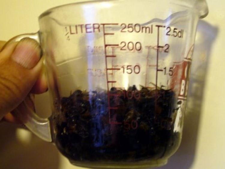 بمجرد العودة إلى المنزل ، تحتاج إلى حساب عدد النحل في العينة ، بحيث يمكنك إجراء التخفيف المناسب بمقدار 1 مل لكل نحلة. لحسن الحظ ، لقد وجدت اختصارًا لحساب عينات كبيرة من النحل يتسم بالدقة الكافية لاتخاذ قرارات العلاج. قم ببساطة بتصفية الكحول من النحل ، وضع أجسامهم الرطبة في كوب قياس عن طريق دك قاع الكوب في راحة يدك. يحدث فقط أن النحل الميت الرطب يتجمع إلى حوالي 3 نحلات لكل مليلتر ، وبما أنك تريد إضافة 1 مل لكل نحلة ، يمكنك ببساطة تخفيفها بثلاثة أضعاف حجم الماء الذي يوجد به حجم النحل. على سبيل المثال ، إذا كان لديك ربع كوب من النحل ، أضف ثلاثة أرباع كوب من الماء (لنصف كوب ، أضف 1-1 / 2 كوب من الماء).