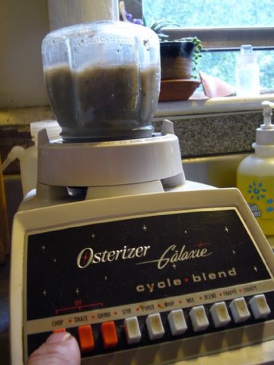 طريقة حجمية سريعة لـ "عد" عدد النحل المصفى في العينة. يوجد ما يقرب من 3 نحلات لكل مليلتر. لذا فإن هذه العينة المكونة من 100 مل من النحل ستحتوي على حوالي 300 نحلة ، وتحتاج إلى 300 مل من الماء لتخفيفها للحصول على عدد موحد من الأبواغ. بشكل عام ، استخدم 3 أضعاف حجم الماء مثل النحل الجموع. كلما كنت أكثر ذكاءً ، ستدرك أيضًا أن الكحول الذي يتم تصريفه من هؤلاء النحل سيحتوي على كل حشرات الفاروا (إذا هززت الجرة). إذاً لديك فرصة لعمل "twofer" - خذ عينة من nosema ، وعينة ساحة دقيقة للإصابة بالعث في نفس الوقت! يحتاج النحل إلى طحن لإطلاق الجراثيم في أحشائه. الطريقة الأسرع (والأكثر اتساقًا) التي وجدتها هي استخدام خلاط المطبخ ، وقم بتقطيعها أعلى في أبطأ إعداد (لا ترغب في تسييلها تمامًا ، لأن ذلك يجعل الكثير من الحطام للعرض). قم بتفريغ الكمية المقاسة من النحل في إناء نصف لتر أو نصف لتر يناسب مجموعة شفرات الخلاط. ثم أضف ثلاثة أضعاف كمية الماء الموجودة في النحل. اربط مجموعة الشفرة ، واضغط على زر "القطع" لجرعتين مدتهما 5 ثوانٍ ، مع التأكد من أن كل نحلة قد تقلصت إلى قطع صغيرة. طحن عينة من النحل في خلاط المطبخ لتحرير أبواغ النوزيما من أحشائها. قطرة واحدة من الملاط المتجانس الناتج .