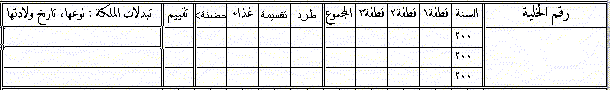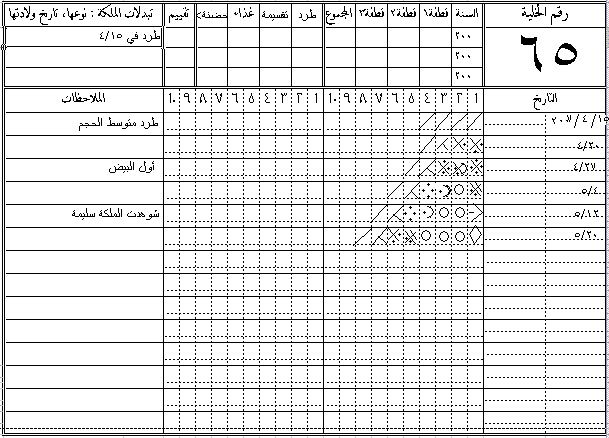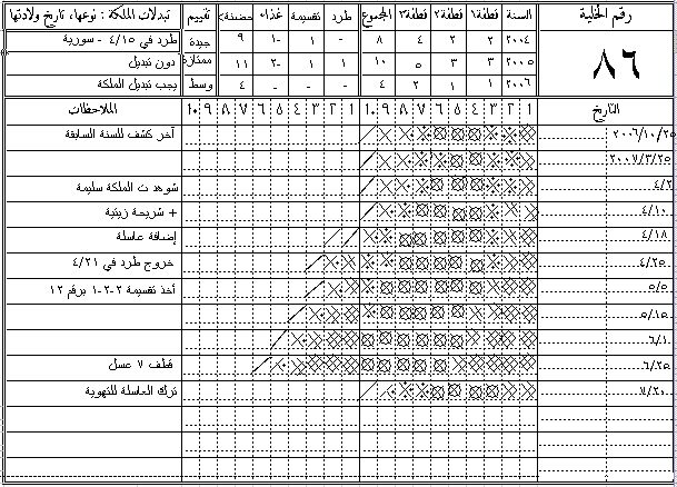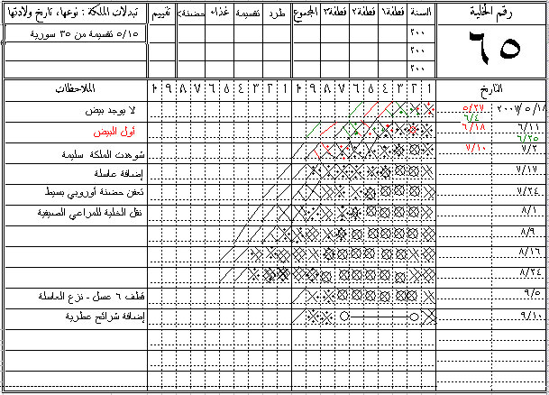 - تبدلات الملكة: يسجل هنا البيانات المتعلقة بالملكة من حيث نوعها وتاريخ ولادتها (بالشهر والسنة) وتاريخ إدخالها للخلية ومصدرها... وتبديلها... وغير ذلك.