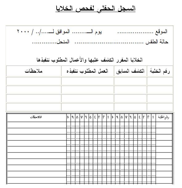 تنصح الأدبيات النحلية باستعمال سجل للخلايا هي عبارة عن جدول به أعمدة عن معلومات مطلوب تسجيلها لا تعطي فكرة جيدة عن الخلية. وقد وجدت منذ بداية عملي في تربية النحل أن هناك حاجة لتسجيل فحص الخلية بتفصيل يعطي فكرة جيدة عما هو موجود داخل القفير وحالة الطائفة وخاصة: