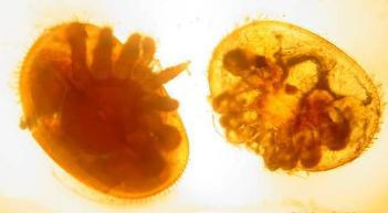 أكاروس صغير Varroa jacobsoni أو Varroa destructor يرى بالعين المجردة طوله 1,2 مم - وعرضه 1,4مم لونه بني غامق، يتغذى على دم النحل