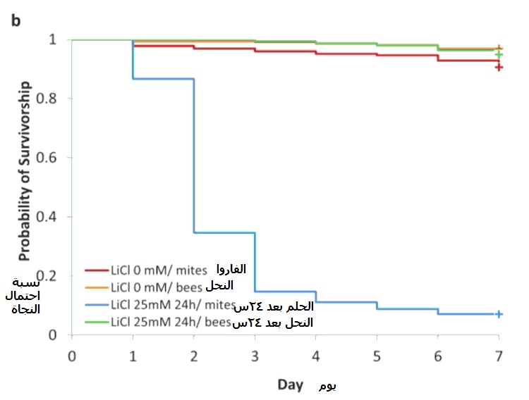 قام العلماء بتفصيل نتائجهم المذهلة في نشرة التقارير العلمية في 12 يناير. V. destructor ، المعروف أكثر باسم عثة (حـَلـَم) الفاروا Varroa mite ، هو آفة نحل العسل في جميع أنحاء العالم. عند التسلل إلى خلية النحل، تمتص دم (هيمولمف hemolymph) النحلة وتنقل لهاالأمراض التي تحملها. ووفقًا لوزارة الزراعة الأمريكية ، فإن 42 بالمائة من خلايا النحل التجارية في الولايات المتحدة كانت موبوءة في صيف عام 2017 ، وقال 40 بالمائة من مربي النحل إن الطفيل قد أضر بشكل خطير بخلاياهم. وبالمقارنة ، أبلغ 13 في المائة فقط عن حدوث ضرر من مبيدات الآفات. يقول الباحثون إن المركبات الكيميائية موجودة لمكافحة الطفيليات لكنها قديمة وغير فعالة بشكل متزايد، مضيفين أنه لم يتم تسجيل أي مركبات نشطة جديدة في السنوات الخمس والعشرين الأخيرة. دفعت ندرة الخيارات العلماء في الجامعة العبرية في القدس إلى تجربة تقنية تسمى تداخل الرنا. قاموا في دراستهم بإطعام النحل رنا RNA مزدوج الشريطة عبر محلول سكري لضرب الجينات الحيوية في حلم الفاروا. بلعت الفارواالحمض النووي الريبي (رنا RNA) القاتل عن طريق السائل الدموي وماتت بعد ذلك. مستوحاة من تلك النتائج، سعى الباحثون الألمان إلى تطبيقها بتكرار التجربة بطرق معدلة قليلاً. في الواقع، سرعان ما ماتت الفاروا التي تصيب النحل التي كانت تُغذى بماء السكر مع الحمض النووي الريبي المصمم، ولكن الفاروا في المجموعة الضابطة أعطي RNA آخر كان من المفترض أن يكون غير فعال. دفعت النتائج المذهلة الباحثين إلى الشك في أن كلوريد الليثيوم المستخدم في إنتاج الحمض النووي الريبي ـ وبالتالي المتواجد في ماء السكر ـ كان بالفعل يقتل الطفيليات. وأكدت مجموعة من الفحوص اللاحقة فرضيتهم. قام العلماء بعد ذلك بإجراء العديد من التجارب لاختبار كلوريد الليثيوم ضد حلم الفاروا، بما في ذلك تلك الدراسات التقريبية الميدانية. ووجد الباحثون أن إطعام نحل العسل بكميات ضئيلة من كلوريد الليثيوم (بتركيز لا يزيد على 25 ملليمترا) على مدى 24 إلى 72 ساعة قضى على 90 إلى 100 في المائة من عث الفاروا دون زيادة كبيرة في معدل موت النحل. (الشكل أدناه: يوضح النسبة الباقية من النحل والفاروا التي تتغذى على كلوريد الليثيوم مقارنة بتلك التي لا تغذى بكلوريد الليثيوم). ![]()