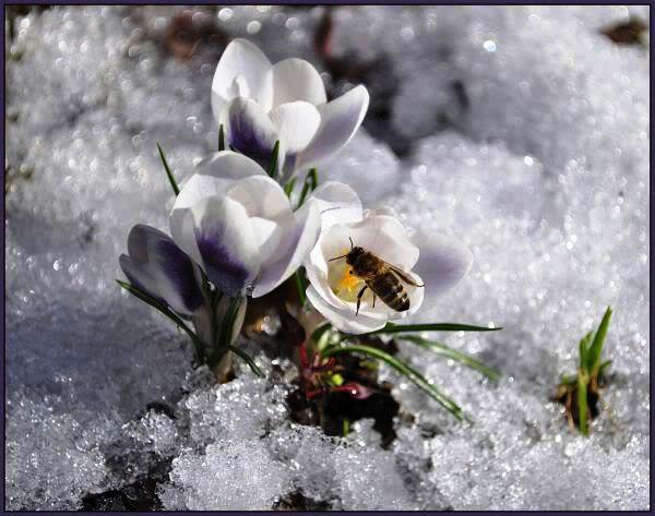 من تحت الثلج زهرة تنتظرها نحلة رغم البرد ..!