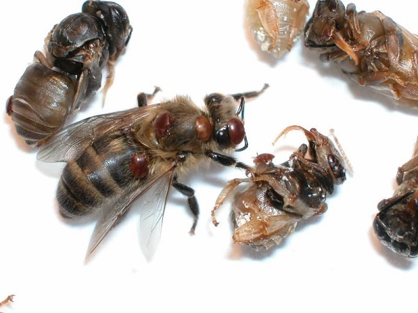 وجدنا أن أعدادًا كبيرة من الطفيلي تنتشر إلى خلايا النحل الأسود (في كل من خلايا النحل القريبة والبعيدة) عندما انهارت خلايا النحل الأصفر من تفشي الطفيلي وأصبحت أهدافًا للسرقة من قبل خلايا النحل الأسود. نستنتج أن "إغراء اللصوص" هو مصطلح أفضل من "قنابل الطفيلي" لوصف الخلايا التي تخضع لأحمال عالية من الحلم وتنقل الطفيلي إلى الخلايا المجاورة.