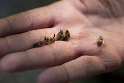 5- زحف بأعداد كبيرة وموت مفاجئ أمام الخلية وداخلها مع خروج أجزاء الفم وامتدادها وتفحم النحل أحيانا واختزال جسمه، يدل على التسمم بالمبيدات.