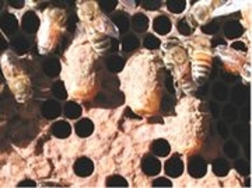 4- خذ حوالى 150 نحلة من خلية مصابة، من براويز الحضنة، بواسطة قمع ورقى وضعها برفق في البرطمان، ثم ضع قطعة من الكاندي أو بديل حبوب لقاح، وغطى البرطمان بالسلك فقط وأحكم غلقه بالمطاط.