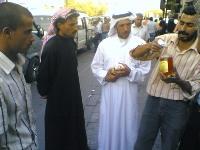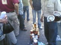 ينادي الشاب قائلا "عسل طبيعي من المساعدات العراقية، النفط مقابل الغذاء" في محاولة لإيهام المتحلقين حوله، بان هذا العسل الرخيص وصل إليه بطريقة ما بدلاً من الذهاب كمساعدات للإخوة العراقيين، وسعر العبوة 1 كغ بـ100 ليرة فيما يبيعه أخر بـ150 ل.س. يتشجع احدهم(لا نعرف ان كان بالاتفاق معه كما العادة في مثل هذه الحالات) ويطلب عبوتين، ثم تنهال عليه الطلبات، فيتولى الشاب عملية البيع، بينما يقوم آخر بفتح إحدى العبوات ويمررها على المترددين ليشموا رائحة العسل. مع ازدياد طلبات الشراء وتبدل المتجمهرين، تصل صناديق أخرى بعبوات جديدة، ويطور الشاب البائع بهلواناته بالبيع، فيغمس إصبعه بالعسل ويرفعها عالياً مؤكدا بأنه عسل حقيقي، ينساب خيط العسل الرفيع من إصبعه إلى العبوة دون أن ينقطع.