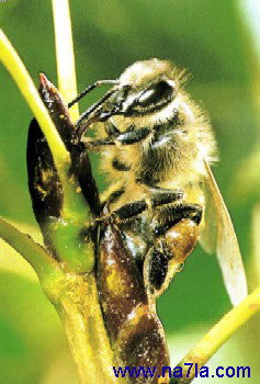 ما يلبث أن ينفصل عن النقطة الأصلية. مثل هذه الخيوط تُنقل من الفكين بمساعدة الزوج الثاني من الأرجل وتُنقل إلى الخلف وتوضع في سلَّتيّ الطلع. وهكذا تُعاد العملية إلى أن تتجمَّع كمية من العكبر فيهما.