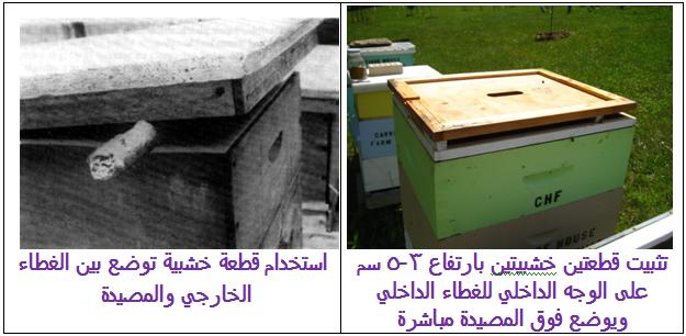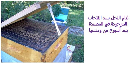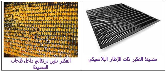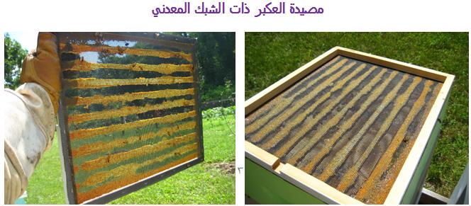 ((نقلاً عن موقع نحلة www.na7la.com بإدارة الدكتور طارق مردود)) طريقة الاستخدام: يوضع هذا الإطار مكان الغطاء الداخلي، لكن الأمر المهم هو تحفيز النحل على جمع العكبر ويتم ذلك من خلال رفع الغطاء الخارجي مسافة 3-5 سم للسماح بدوران الهواء في الخلية ودخول قليلاً من الضوء للخلية، ويتم ذلك بعدة طرائق: إما باستخدام قطعة خشبية توضع بين الغطاء الخارجي والمصيدة أو بتثبيت قطعتين خشبيتين بارتفاع 3-5 سم على الوجه الداخلي للغطاء الداخلي ويوضع فوق المصيدة مباشرة، وفوقه الغطاء الخارجي كما هو موضح في الشكل. وبعد أن يقوم النحل بملء الفراغات الموجودة في المصيدة بمادة العكبر يقوم النحال بجمع المصائد ثم توضع في المجمدة لعدة ساعات، حيث يصبح العكبر صلباً ويمكن إزالته بسهولة من الإطار باستخدام شوكة الكشط المستخدمة في كشط الغطاء الشمعي عند فرز العسل أو باستخدام شوكة الطعام العادية، بعدئذٍ يجمع العكبر الناتج في وعاء محكم ويوضع في البراد لحين استخدامه. 2. مصيدة العكبر ذات الشبك المعدني: الوصف: عبارة عن إطار خشبي له أبعاد صندوق التربية (40.5×51 سم في الخلية المعدلة السورية، 51.2×37.2 سم في خلية لانغستروث غير المعدلة)، ارتفاع خشب الإطار 3-5 سم، يثبت قطعة من الشبك المعدني (غربال خشن) على أحد وجهي الإطار، كما هو موضح في الصورة.