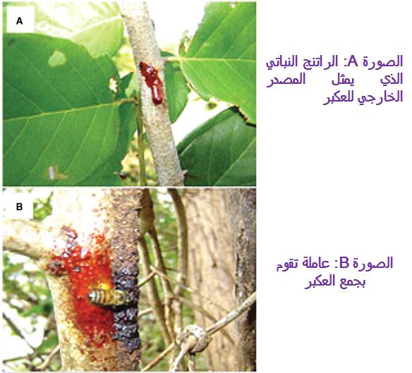 المصدر الداخلي للعكبر: ينتج العكبر كمخلف صمغي نتيجة الهضم الأولي لغبار الطلع داخل العضو الواقع بين معدة العسل والمعدة الهاضمة للنحلة. ويستعمل النحل هذا النوع في صقل وتطهير العيون السداسية المعدة لوضع البيض بها، وتعد إطارات الشمع التي تضع ملكة النحل البيض بها أكثر تعقيما من أحدث المستشفيات. يعتمد تركيب البروبوليس على نوع النبات الذي قام النحل بجمعه منه، كما يختلف لونه ورائحته وخصائصه الطبية تبعاً للمصدر والفصل. ((نقلاً عن موقع نحلة www.na7la.com بإدارة الدكتور طارق مردود)) كيف تقوم العاملات بجمع العكبر؟ بعد أن تعثر عاملةَ نحل العسل الجامعة للبروبوليس على مصدر البروبوليس تقوم بقضمه بوساطة فكوكها العليا وتحاول بمساعدة الزوج الأمامي للأرجل تمزيق قطعة صغيرة منه، وتقوم بعجن هذه القطعة بين فكوكها العليا وذلك بمساعدة واحدةً من الأرجل الوسطى، وبسرعة تقوم بنقل قطعة البروبوليس إلى سلة غبار الطلع التي على نفس الجانب, وتقوم بذلك أثناء وقوفها أو خلال الطيران, ويلي ذلك وضع قطعة أخرى من البروبوليس في سلة غبار الطلع التي على الجانب الآخر, والبروبوليس المتجمع يتم كبسه بشكل متكرر بوساطة الرجل الوسطى لجعله في قالب مناسب, وتستمر في جمعها حتى تكتمل حمولة كلٍ من سلتي غبار الطلع, ولتحصل النحلة على حمولة بروبوليس فإنها تعمل بنشاط في وقت يتراوح من خمسة عشر إلى ستين دقيقة. وعند دخول النحلة للخلية وهي محملة بالبروبوليس تقوم بإفراغ حمولتها بمساعدة عاملات أخريات والتي تقوم بقضم البروبوليس ودفعه وتمزيقه إلى قطع صغيرة, وعندئذٍ تضغطه وتكبسه بقوة في مكانه، وعند تداول البروبوليس ووضعه في مكانه فإن النحل الملامس يقوم بإضافة مفرزات لعابية مختلفة إلى هذا الصمغ، كما تضيف إليه شرائح من الشمع الذي يصنعه النحل بنسبة من 40 إلى 60% شمع، فيخرج مزيج خاص من صنع النحل تستخدمه في طريقتين: الأولى في تثبيت خلية النحل ودعمها وإغلاق الثقوب والفتحات التي فيها، والثانية كمادة حامية لخلية النحل تقف سداً منيعاً ضد دخول تلك الجراثيم والفطور إلى الخلية !!. وتتحرر النحلة من حمولتها من البروبوليس خلال ساعة واحدةٍ أو عدة ساعات؛ حيث يعتمد ذلك على استخدام البروبوليس في الخلية, وعندما تتحرر من حمولتها فإنها تقوم بالسروح في الحال لعمل حمولة أخرى. ويتم جمع البروبوليس في الأيام الدافئة فقط, والنحلة الجامعة للبروبوليس تظل ملتزمةً بهذا العمل, ولكن أعدادها قليلة في كل طائفة, وفي وقت ندرة الرحيق يتحول النحل الجامع للبروبوليس إلى نحل جامع للرحيق ثم يعود مرة ثانية لجمع البروبوليس. والنحل الجامع للبروبوليس عند إحضار حمولته لداخل الخلية يؤدي رقصةً في محاولة منه لتجنيد آخرين للقيام بذلك، ولكن بعض النحل فقط يتبع النحلة الراقصة طواعيَّةً رغم كونه غيرَ مجنَّدٍ لذلك. ((نقلاً عن موقع نحلة www.na7la.com بإدارة الدكتور طارق مردود))