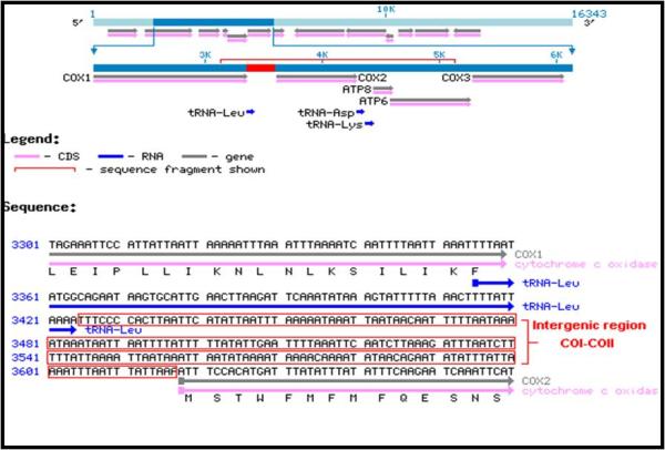 شكل 2. تركيب المنطقة بين الجينية COI-COII في الحمض النووي الميتوكوندري عند نحل العسل.