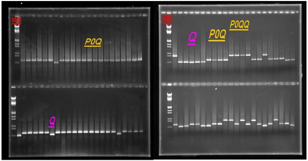 استخدم 4 lµ من ناتج عملية التضخيم مع 6 µl من أزرق البروموفينول Bleu de Bromophynole وأجري للمجموع عملية رحلان كهربائي Electrophoresis على هلامة أجار 1.4% مع المعلم الجزيئي MIII ، شكل 3.