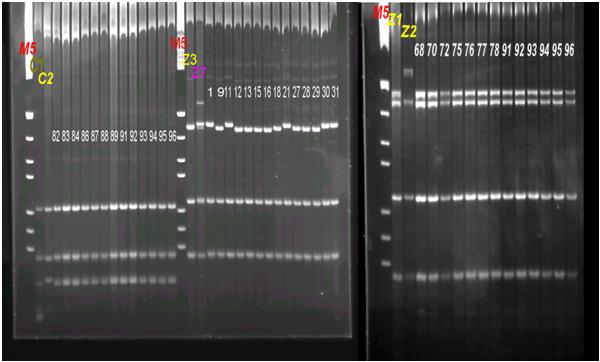 شكل 3. نتائج رحلان الحمض النووي الميتوكوندري mtDNA لنحل العسل السوري على هلامة أجار 1.4%.