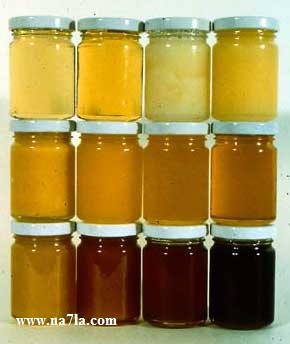 وعن الوان العسل قالت ان العسل الأبيض الفاتح هو من البرسيم (جت) والذهبي من فصل الربيع والغامق من السدر والشهد هو العسل ما دام لم يعصر من شمعه وان غذاء ملكة النحل يطلق عليه (الشهد الملوكي) ويعتبر العسل طبيعيا اذا لم تزد نسبة الرطوبة فيه عن 18 بالمئة وحينئذ يختم عليه النحل بطبقة رقيقة من الشمع.