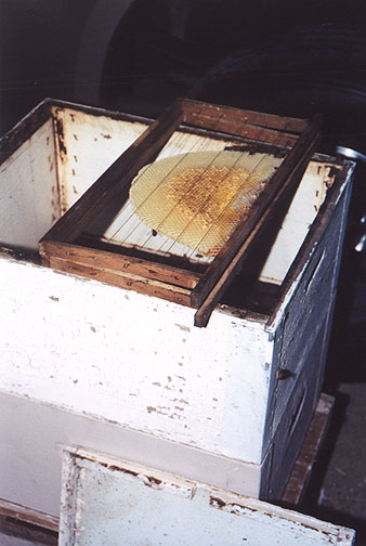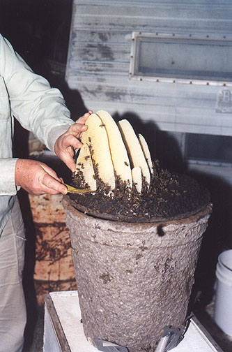 ثم نقوم بقلب الغطاء مع ما يحمله من شمع ونحل رأساً على عقب. |