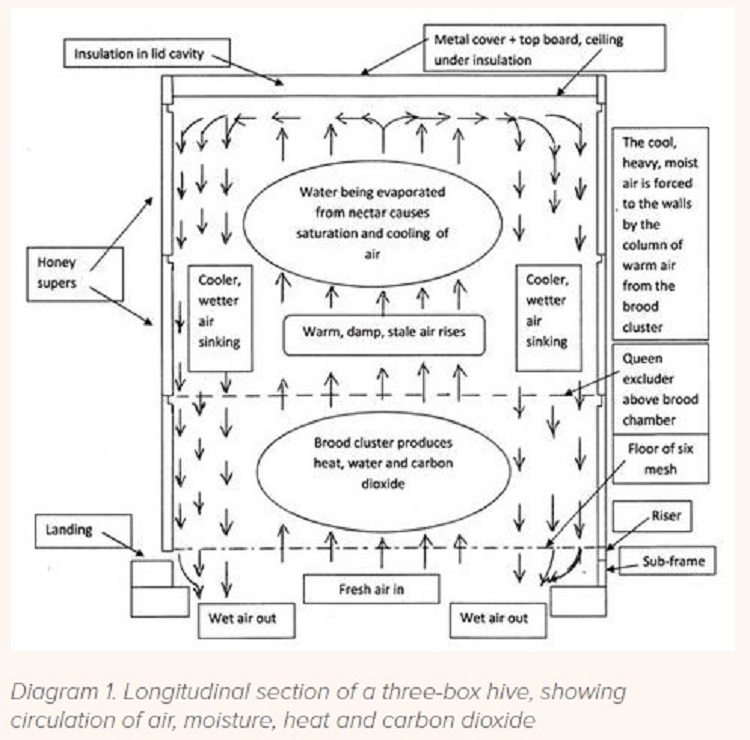 تعتمد التغييرات على أن مجموعة الحضنة هي "المحرك" الذي يحرك الهواء الرطب ويؤمن خروجه من القفير، بشرط ألا يكون هناك فتحة كبيرة للحث على تأثير المدخنة، والتي لا يتم برمجة النحل للتعامل معها. في الشتاء وفي الليالي الباردة، يتصاعد الهواء الحار الرطب المتصاعد من مجموعة الحضنة إلى غطاء معزول ويتم إجباره على الانسياب على الجدران بسبب ارتفاع الهواء الساخن أسفله فيبرد ويخرج من الخلية من الأسفل، مع حمله الرطوبة وثاني أكسيد الكربون غير المرغوب فيه معها. غطاء بارد غير معزول سوف يتسبب في تكثيف الرطوبة والبقاء في الخلية. يمكن للنحل أن يتحمل الظروف الجافة الباردة، ولكن الظروف الرطبة الباردة هي إشكالية. الأسوأ من ذلك، قد يسمح غطاء غير معزول ومهوى بالخروج من ثاني أكسيد الكربون، ولكنه سيسمح بالاحتفاظ بالماء والتبديد المفرط للحرارة. في الصيف. يزيل الدوران الطبيعي نفسه الماء من الرحيق. يؤدي التبريد التبخيري إلى غرق الهواء البارد الرطب والخروج من قاع الخلية. انظر الرسم البياني 1.
