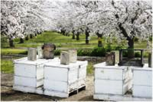 توضع خلايا نحل العسل هذه في بستان مزهر في مقاطعة Yolo ، كاليفورنيا. يعتمد إنتاج اللوز اعتمادا كبيرا على الملقحات، واللوز غني بالطاقة والدهون والبروتينات والعناصر الغذائية الرئيسية مثل كثير من المغنيسيوم والكالسيوم وفيتامين (H) وغيرها.