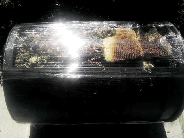 بعد وضع الشمع في البرميل فوق الشبك يجري تغطيته بغطاء نايلون (بولي إيثيلين) لحفظ الحرارة في الداخل